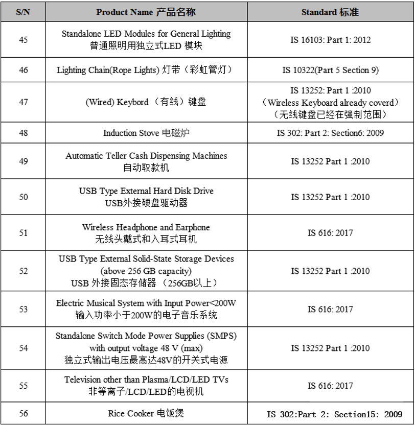 印度BIS纳入强制注册的56项产品目录: