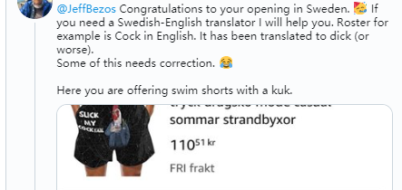 据悉,亚马逊瑞典站为客户提供30多个类别的1.5亿种产品,但其中一些产品由于翻译错误,在产品说明中使用了令消费者感到不适的字眼。