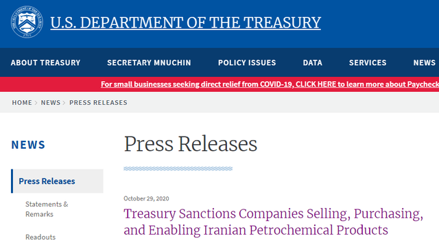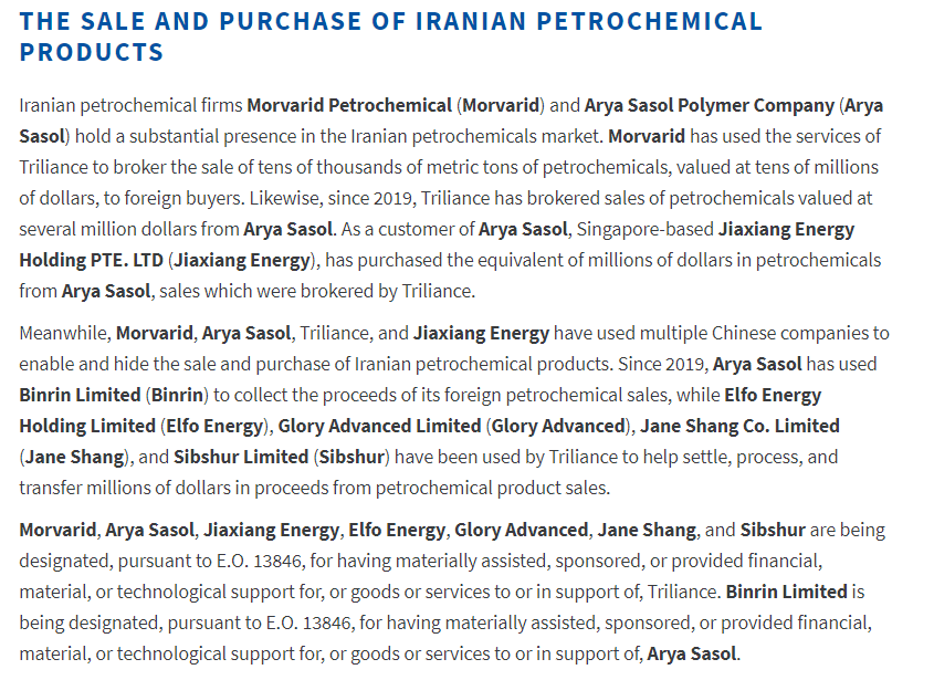 美国国家财政部的申明声称,这8家实体参加了由众祥石油化工有限责任公司(Triliance Petrochemical Co. Ltd,总公司坐落于中国香港)促使的买卖,或帮助后面一种解决和迁移售卖这种石油化工商品个人所得的资产。彭博新闻社提及,众祥石油化工有限责任公司2020年一月遭受美国封禁。
