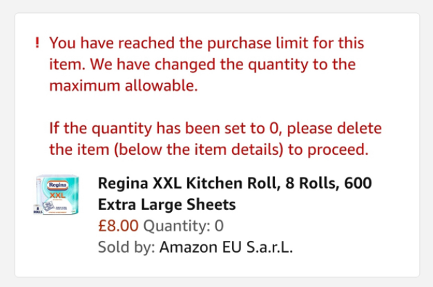 一些产品有销售限制,是的,正如所期望的那样,像厨房用卷这样的产品,消费者似乎无法停止批量购买。亚马逊正在将某些产品限制为每人每天只能购买一件,以阻止在第一场封锁时候出现不理智的大宗购买。