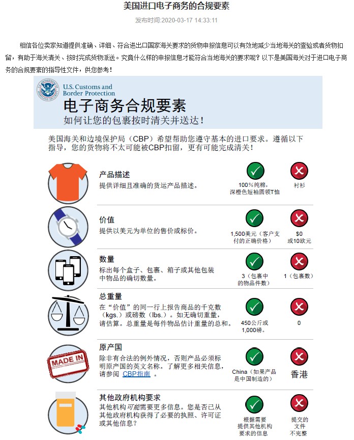 eBay发布公告,向卖家展示美国海关对于进口电子商务的合规要素的指导性文件,以助于卖家减少海关查验,按时清关。