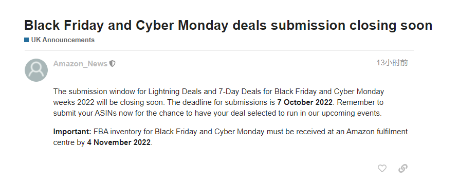 重要提示:黑色星期五和网络星期一的FBA库存必须在2022年11月4日之前送达到亚马逊物流中心。