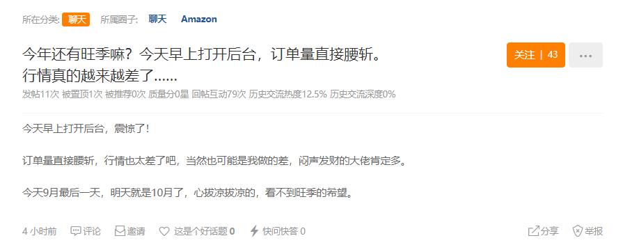 “今年还有旺季嘛?今天早上打开后台,订单量直接腰斩。行情真的越来越差了……”一位卖家说道。